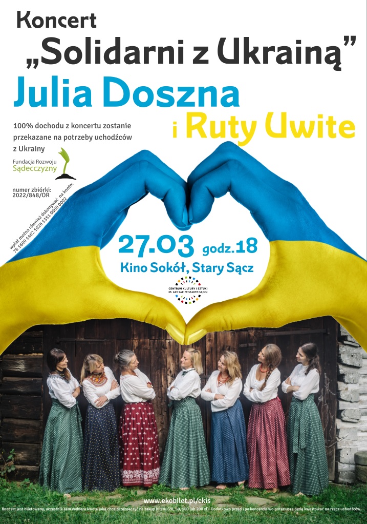 „Solidarni z Ukrainą” Kino Sokół w Starym Sączu, 27 III 2022 niedziela, godz. 18.00.Wystąpi Julia Doszna z zespołem Ruty UwiteO zespole Ruty Uwite to grupa śpiewacza kobiet z Beskidu Niskiego, powstała w 2017 roku. Od 5 lat śpiewa i tworzy pod nazwą Ruty Uwite. Od początku działa pod czujnym okiem Julii Doszny, znanej łemkowskiej i […]