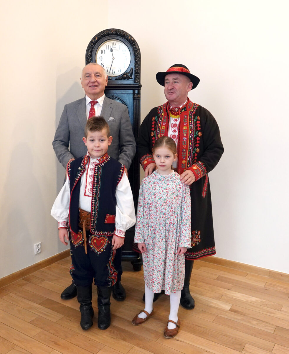 Starosta Marek Kwiatkowski gościł u siebie przedstawicieli Zespołu Regionalnego Mała Helenka z Chełmca. Ola Żelasko, Milan Piątek oraz opiekun zespołu Marek Kiełbasa złożyli świąteczne życzenia staroście Markowi Kwiatkowskiemu i wszystkim pracownikom Starostwa Powiatowego w Nowym Sączu. Fot. Maria Olszowska