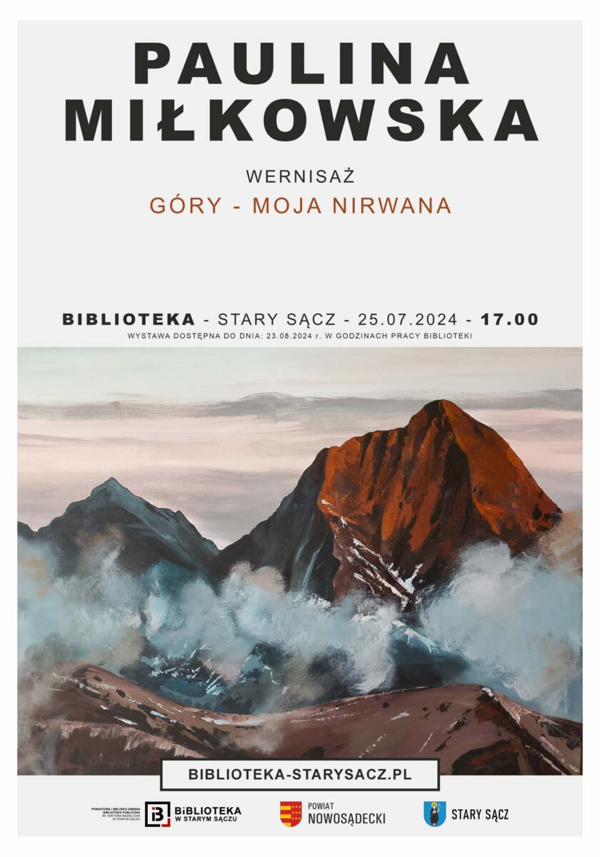 Powiatowa i Miejsko-Gminna Biblioteka Publiczna w Starym Sączu zaprasza na wernisaż wystawy Pauliny Miłkowskiej „Góry – moja Nirwana” w dniu 25 lipca /czwartek/ 2024 r. o godz. 17.00. Wystawa będzie dostępna do dnia 23 sierpnia 2024 r. w godzinach pracy Biblioteki.