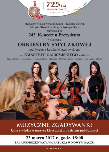 Kolejny, 243. Koncert u Prezydenta odbędzie się 23 marca (czwartek) w sali reprezentacyjnej nowosądeckiego ratusza. Wystąpi Orkiestra Smyczkowa pod dyrekcją Leszka Mieczkowskiego i Kwartet Galicyjski. W programie koncertu organizatorzy zaplanowali także quiz z wiedzy o muzyce klasycznej z udziałem publiczności. Wstęp na koncert jest bezpłatny. Początek koncertu – godz. 18:00. Zapraszamy!