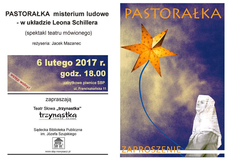 „Pastorałka” – misterium ludowe w układzie Leona Schillera to kolejna propozycja sądeckiego Teatru Słowa „Trzynastka”. Spektakl odbędzie się 6. lutego w zabytkowych piwnicach Sądeckiej Biblioteki Publicznej przy ul. Franciszkańskiej 11. Spektakl nieprzypadkowo odbędzie się w bibliotece, jest bowiem przedstawieniem teatru mówionego. Aktorzy wykonują swoje role czytając tekst. W „Pastorałce” wystąpią Lucyna Ruchała, Joanna Rams, Joanna […]