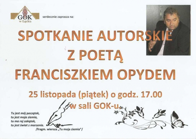 Gminny Ośrodek Kultury w Łącku serdecznie zaprasza na spotkanie z Franciszkiem Opydem, poetą pochodzącym z Maszkowic, które odbędzie się 25 listopada (piątek) o godz. 17.00 w sali GOKu. Franciszek Opyd – ur. w 1953 r. w Łącku, mieszkał w Maszkowicach i tam też ukończył Szkołę Podstawową w r. 1968. Jego przygoda z poezją zaczęła […]