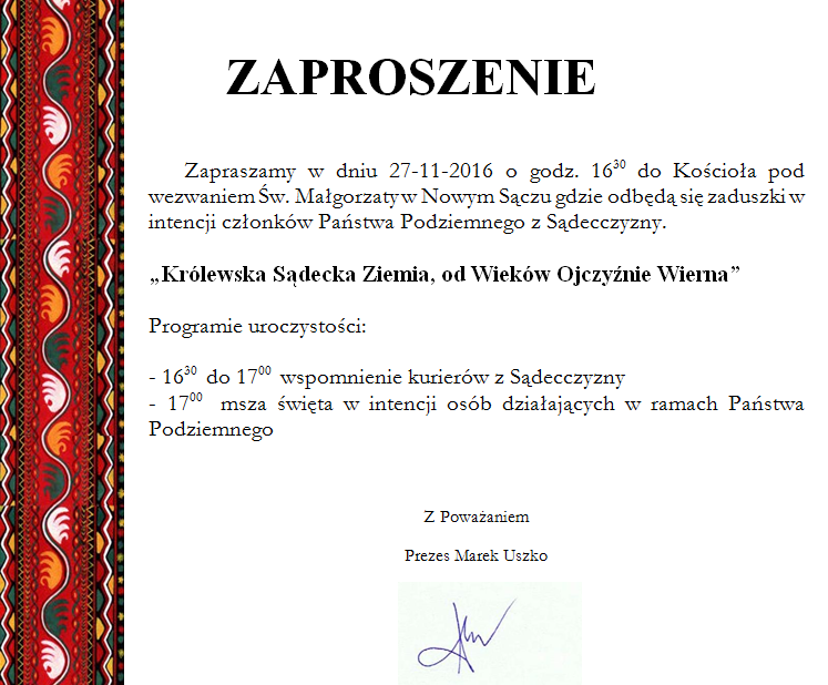 W niedzielę 27 listopada w Bazylice św. Małgorzaty w Nowym Sączu odbędą się zaduszki w intencji członków Państwa Podziemnego z Sądecczyzny. Uroczystość zatytułowano: „Królewska Sądecka Ziemia, od Wieków Ojczyźnie Wierna” Program: 16.30 wspomnienie kurierów z Sądecczyzny 17.00 – Msza święta w intencji osób działających w ramach Państwa Podziemnego. Organizatorem uroczystości jest Lokalna Grupa Działania „Partnerstwo dla […]