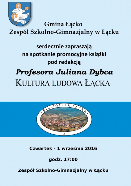 Gmina Łącko, Zespół Szkolno – Gimnazjalny w Łącku zapraszają na promocję książki „Kultura ludowa Łącka i okolic” napisanej pod redakcją Prof. Juliana Dybca, która odbędzie się 1 września (czwartek) 2016 r. o godz. 17:00 w Zespole Szkolno – Gimnazjalnym w Łącku