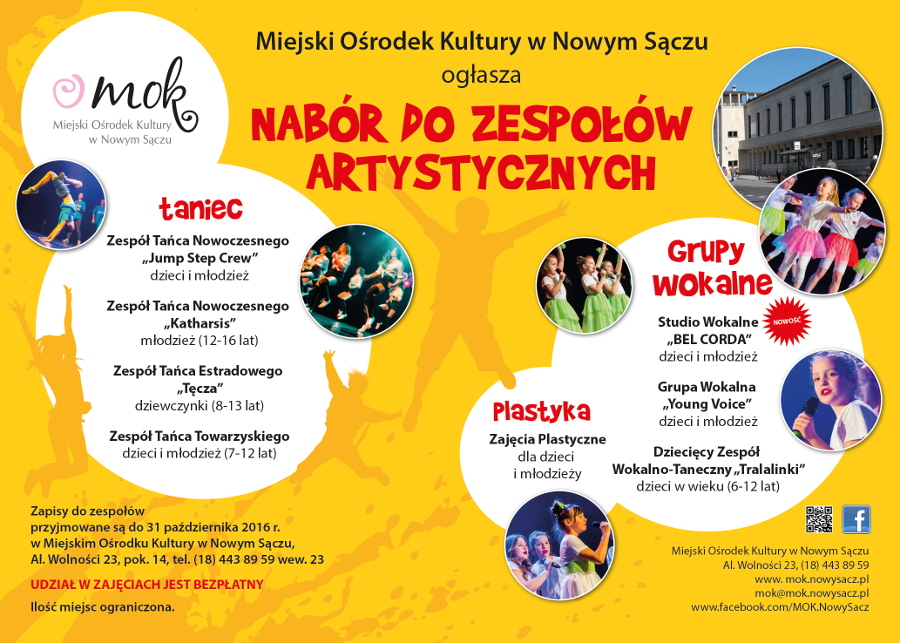 Miejski Ośrodek Kultury rozpoczyna kolejny sezon artystyczny, w którym dyrekcja placówki – podobnie jak w latach poprzednich – duży nacisk kładzie na działalność zespołów artystycznych i kół zainteresowania. Wśród tanecznych propozycji znalazły się między innymi Zespół Tańca Nowoczesnego „Jump Step Crew”, Zespół Tańca Nowoczesnego „Katharsis”, Zespół Tańca Estradowego „Tęcza”, a także Tańca Towarzyskiego. Na młodych […]