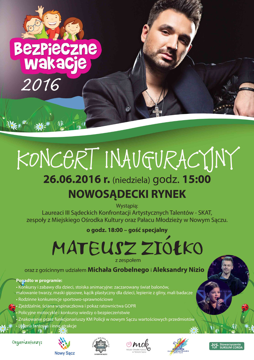 W niedzielę (26 czerwca) o godz. 18:00 na nowosądeckim Rynku odbędzie się koncert Mateusza Ziółko z zespołem w ramach inauguracji akcji „Bezpieczne Wakacje 2016”. Podczas koncertu gościnnie wystąpią Michał Grobelny i Aleksandra Nizio. Od godziny 15:00 przed ratuszem na wszystkich Sądeczan będą czekać liczne atrakcje. Na scenie wystąpią m.in. laureaci III Sądeckich Konfrontacji Artystycznych SKAT, […]