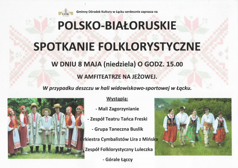 Gminny Ośrodek Kultury w Łącku serdecznie zaprasza na Polsko-Białoruskie Spotkanie Folklorystyczne w dniu 8 maja br. od godz. 15.00. w Amfiteatrze na Jeżowej. W trakcie imprezy zaprezentują się: – Mali Zagorzynianie – Zespół teatru Tańca Freski – Grupa Taneczna Buslik – Orkiestra Cymbalistów Lira z Mińska – Zespół Folklorystyczny Luleczka – Górale Łąccy Serdecznie zapraszamy! […]