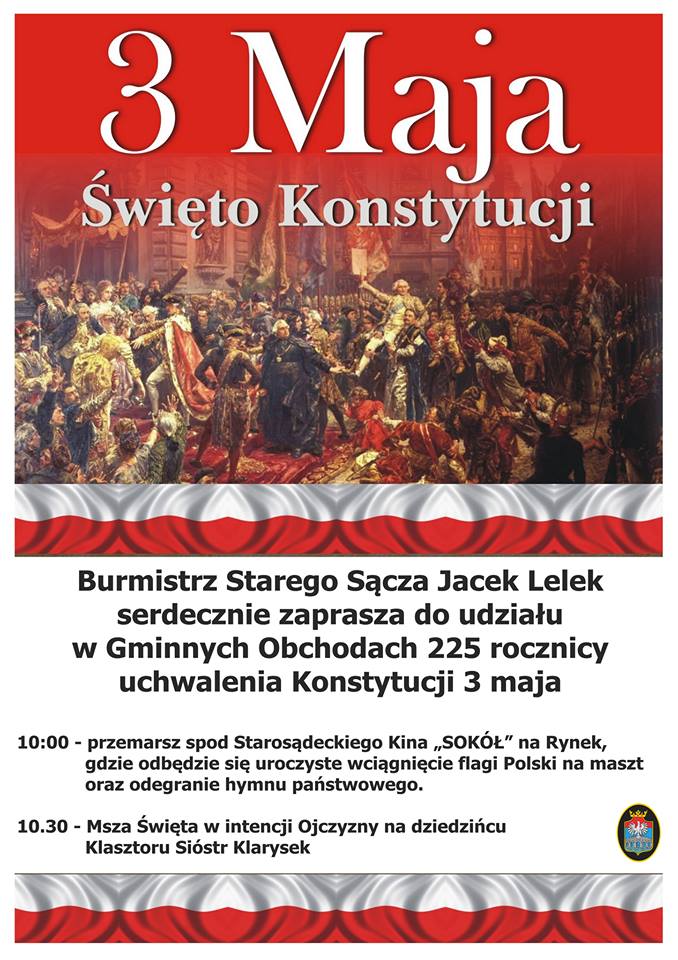 Przemarszem spod Starosądeckiego Kina Sokół na Rynek, gdzie odbyło się wciągnięcie flagi Polski na maszt oraz odegrany został hymn państwowy uczczono Obchody 225 Rocznicy uchwalenia Konstytucji 3 Maja. Obchody zgromadziły samorządowców, harcerzy, przedstawicieli starosądeckich instytucji. Tamburmajorki, Miejską Orkiestrę Stary Sącz oraz policję i straż pożarną. O godzinie 10:30 rozpoczęła się Msza św w intencji Ojczyzny na dziedzińcu Klasztoru Sióstr […]