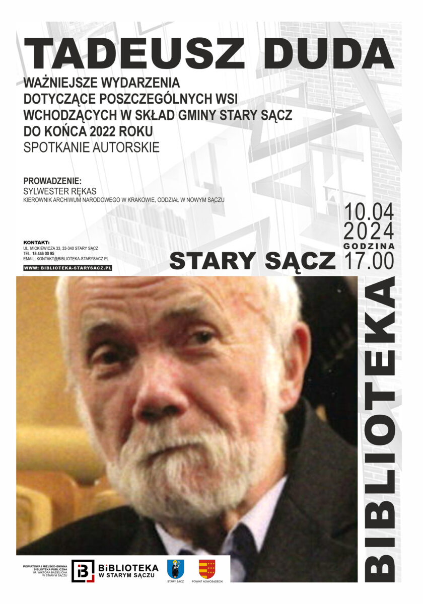 Powiatowa i Miejsko-Gminna Biblioteka Publiczna im. W. Bazielicha w Starym Sączu zaprasza w dniu 10 kwietnia /środa/ 2024 r. o godz. 17.00 na spotkanie autorskie z Tadeuszem Dudą, autorem książki Ważniejsze wydarzenia dotyczące poszczególnych wsi wchodzących w skład Gminy Stary Sącz do końca 2022 roku. Spotkanie będzie prowadził Sylwester Rękas, kierownik nowosądeckiego oddziału Archiwum Narodowego w Krakowie. Tadeusz Duda urodził się 27 […]