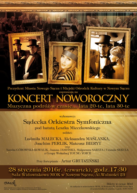 Prezydent Nowego Sącza Ryszard Nowak, zaprasza serdecznie na tradycyjny Koncert Noworoczny, który odbędzie się 28 stycznia (czwartek) o godz. 17:30 w Miejskim Ośrodku Kultury (Al. Wolności 23). Tym razem usłyszymy wielkie przeboje ze starych przedwojennych polskich filmów, a ich wykonawcami będą: Sądecka Orkiestra Symfoniczna, pod batutą Leszka Mieczkowskiego, oraz soliści – Ludmiła Małecka. Aleksandra Maślanka, […]