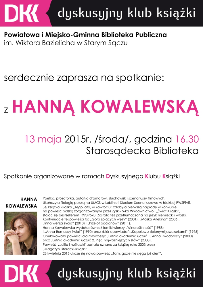 W Ogólnopolskim Tygodniu Bibliotek starosądecka biblioteka serdecznie zaprasza na spotkanie autorskie z Hanną Kowalewską. Spotkanie odbędzie się w ramach Dyskusyjnego Klubu Książki.