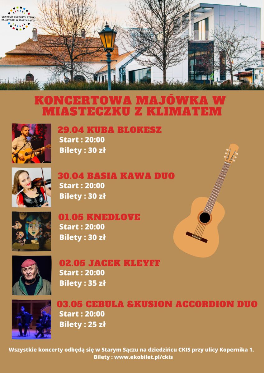 Koncertowa majówka w miasteczku z klimatem. Centrum Kultury i Sztuki im. Ady Sari w Starym Sączu zaprasza na koncerty na „leżakach”. Bilety do nabycia TUTAJ. 29.04 Kuba Blokesz „Wiersze (pod)różne” to zestaw piosenek różnych. Mieszają się tutaj autorzy tekstów, reprezentujący odmienne spojrzenie na świat; tematy, dotykające rzeczy ważnych ale i błahych, czy kompozycje niosące spokojne melodie albo […]