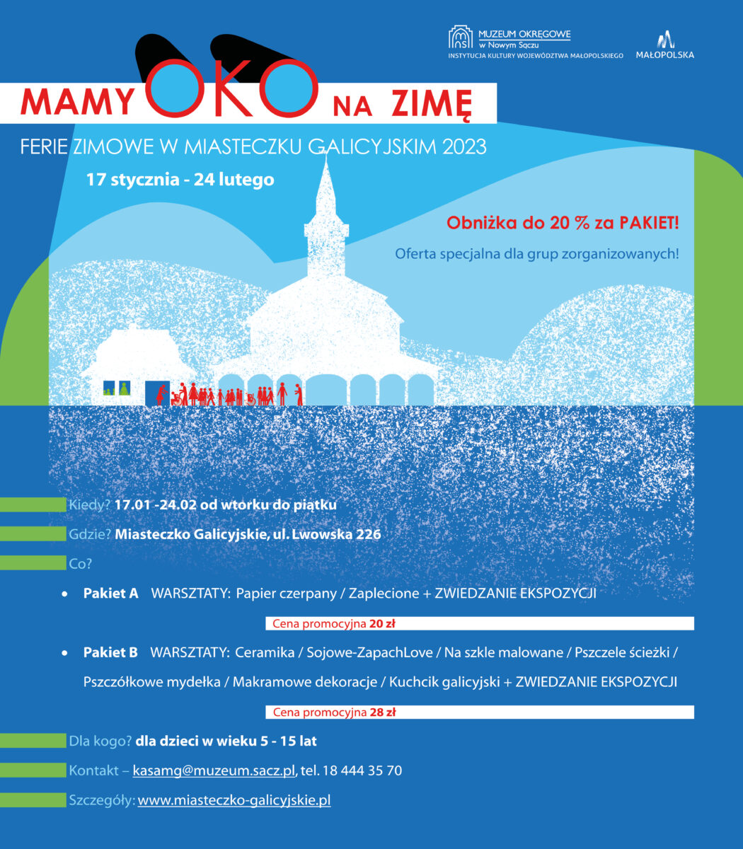Nowy rok szkolny przyniósł nowe pomysły warsztatowe! Zapraszamy grupy zorganizowane do skorzystania z naszej oferty zajęć edukacyjnych. Zaplecione (Nowość)Warsztaty, na których można wybrać jedną z metod wyplatania. Metoda wikliny papierowej – uczestnicy będą mogli wykonać samodzielnie papierowe rureczki, z których stworzą kolorową podkładkę pod kubek w formie domków galicyjskich. Metoda zaplatania sznurków – uczestnicy stworzą […]