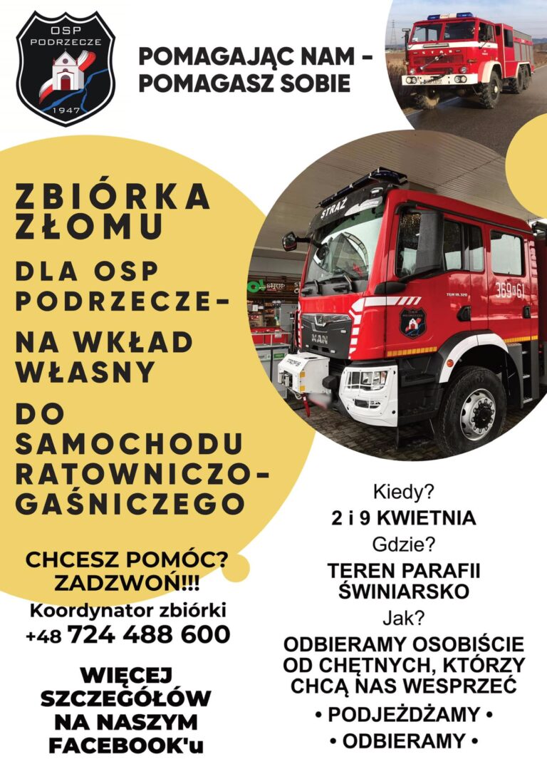 Druhowie Ochotniczej Straży Pożarnej w Podrzeczu (gm. Podegrodzie) już 2 kwietnia organizują zbiórkę złomu. Brakuje im niewiele do zakupu nowego wozu bojowego. Jeśli jesteście w posiadaniu złomu to dzielni strażacy odbiorą go osobiście. Wystarczy zadzwonić: 724 488 600. -Ostatnie lata były dla nas bardzo pracowite, zarówno pod względem działań ratowniczych, jak również różnych akcji podejmowanych […]