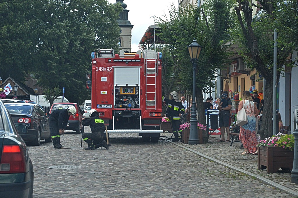 Strażacy nie tylko ratują ludzi i gaszą pożary. Dziś przed południem ruszyli z pomocą małemu kotkowi. W rynnie, jednego z budynku w Rynku utknął kot. Dzielni strażacy natychmiast podjęli akcję ratowniczą i uwolnili zwierzaka.