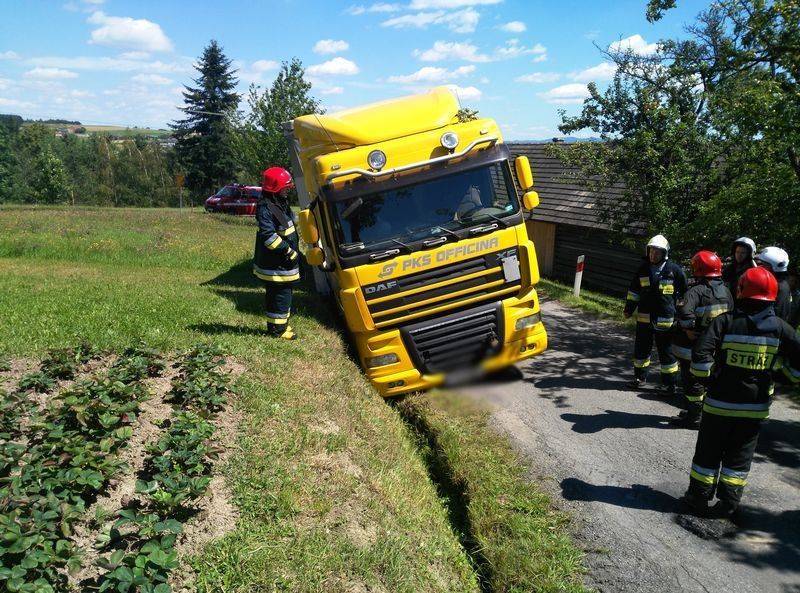 Brzezna. Ciężarówka „zsunęła” się z drogi