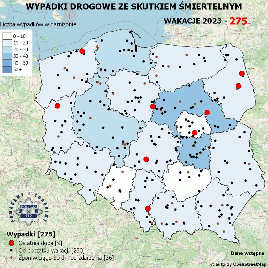 Policyjna mapa wypadków drogowych ze skutkiem śmiertelnym – Wakacje 2023