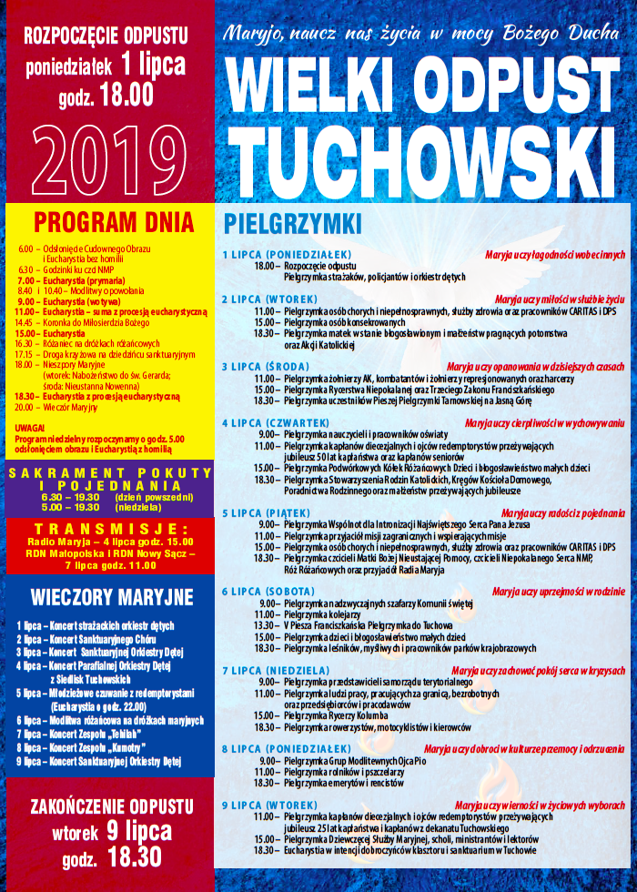 Pielgrzymi z różnych zakątków kraju będą się modlić w sanktuarium Matki Bożej Tuchowskiej, gdzie 1 lipca rozpocznie się Wielki Odpust. Zaplanowano Msze św., koncerty, czuwanie dla młodzieży i liczne nabożeństwa. Każdego dnia będzie też spowiedź. Wyjazd na odpust Tuchowski organizuje Akcja Katolicka przy parafii św. Elżbiety w Starym Sączu. Wyjazd we wtorek 02 lipca z parkingu […]