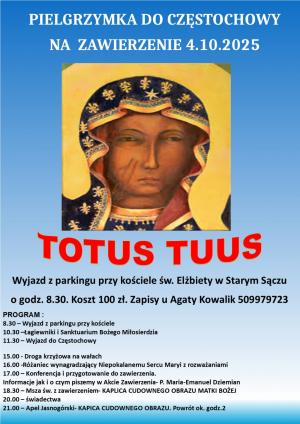 Parafia św. Elżbiety w Starym Sączu organizuje wyjazd na zawierzenie w sobotę, 4 października 2025 roku. 🔹 Wyjazd o godz. 8:30 z parkingu przy kościele św. Elżbiety🔹 Koszt: 100 zł🔹 Zapisy prowadzi Agata Kowalik – tel. 509 979 723 Więcej informacji w załączniku oraz na stronie parafialnej w zakładce Akcja Katolicka. Serdecznie zapraszamy!