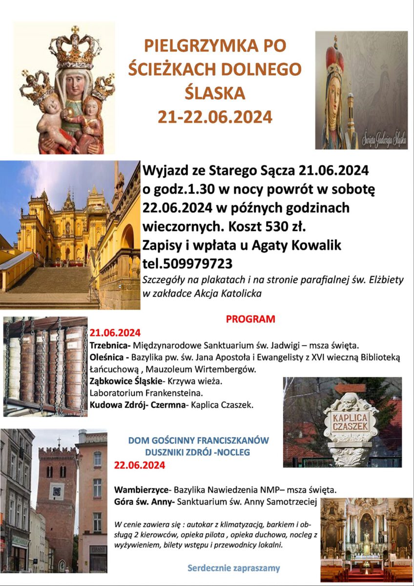 Serdecznie zapraszamy na pielgrzymkę Akcji Katolickiej parafii św. Elżbiety w Starym Sączu do Chorzelowa, która odbędzie się 18.05.2024. Wyjazd z parkingu przy kościele o godz. 5.50. Koszt z posiłkiem 80 zł . Zapisy u Agaty Kowalik(509979723) do 10.05.2024 PROGRAM Godz. 9.45 Historia sanktuarium w Chorzelowie – Ks. Prałat Andrzej Rams – Kustosz Sanktuarium Matki Bożej Królowej […]