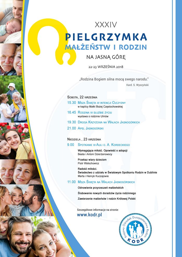 22 i 23 września odbędzie się Pielgrzymka Małżeństw i Rodzin na Jasną Górę. Będzie to okazja do modlitwy i formacji. Uroczysta Msza św. zostanie odprawiona o godz. 11.00. Podczas Eucharystii nastąpi odnowienie przyrzeczeń małżeńskich i ślubowanie nowych doradców życia rodzinnego.