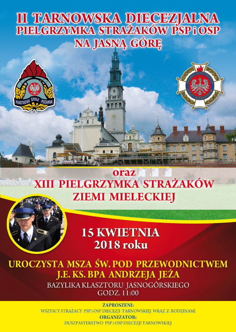 Duszpasterstwo Strażaków PSP i OSP Diecezji Tarnowskiej, zaprasza wszystkich Druhów wraz z rodzinami na II Diecezjalną Pielgrzymkę Strażaków oraz XIII Pielgrzymkę Strażaków Ziemi Mieleckiej na Jasną Górę w niedzielę 15 Kwietnia 2018 roku. Uroczystej Mszy św. koncelebrowanej przez Kapelanów Straży Pożarnej Diecezji Tarnowskiej w Bazylice Jasnogórskiego Sanktuarium o godzinie 11:00 przewodniczyć będzie J.E. Ks. Bp Andrzej Jeż.