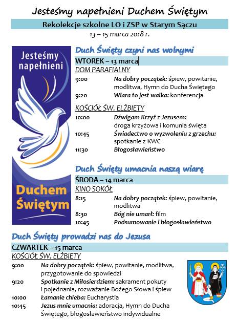 Rekolekcje dla Szkół Podstawowych oraz Gimnazjów w Starym Sączu. Rekolekcjonista: o. Rajmund Jurolajtis SNMP Poniedziałek 05.03 -Konferencja wprowadzająca (Kościół parafialny św. Elżbiety) Klasa 2 i 3 Gimnazjum + Klasa 7 Szkoły Podstawowej -8:00-9:40 Klasy 4-6 Szkoły Podstawowej 10:00-11:20 Klasy 1-3 Szkoły Podstawowej 12:00-13:10 Wtorek 06.03 -Konferencja do filmu (Kino Sokół w Starym Sączu) Film: Bóg […]
