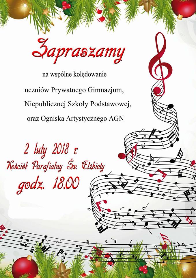 2 lutego 2018 w Kościele parafialnym pod wezwaniem św. Elżbiety w Starym Sączu, uczniowie Prywatnego Gimnazjum, Niepublicznej Szkoły Podstawowej oraz AGN Ogniska Artystycznego dali przepiękny koncert kolęd i pastorałek. Po mszy zaprosili wszystkich zgromadzonych do wspólnego kolędowania.
