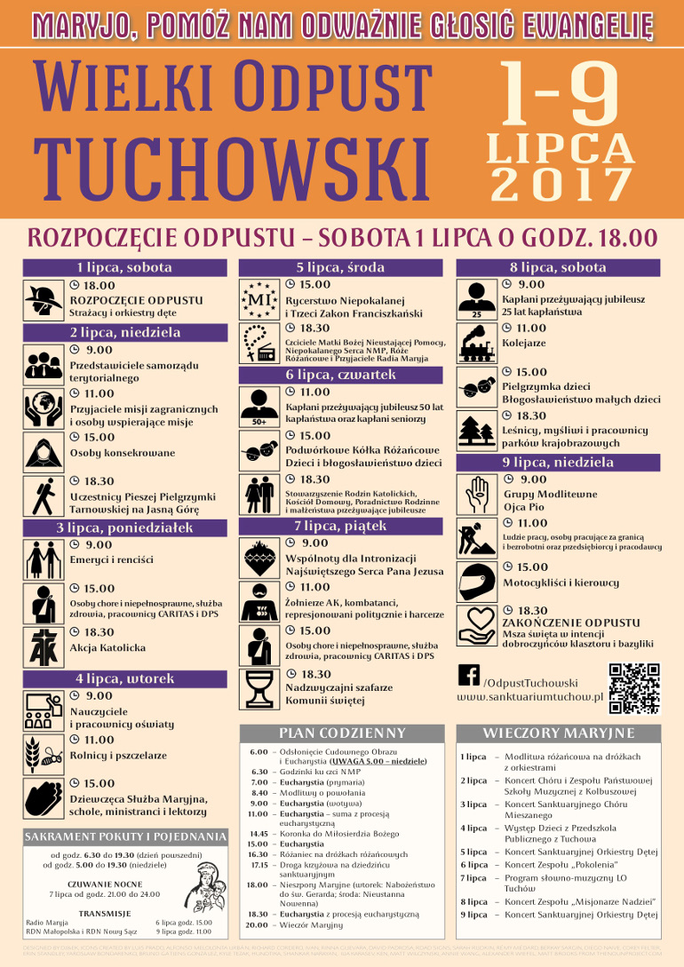 W sobotę (1.07) rozpoczyna się Wielki Odpust Tuchowski 2017 o godz. 18.00 uroczystą Eucharystią z udziałem pielgrzymki strażaków i strażackich orkiestr dętych. Wszystkich parafian, pielgrzymów, gości i czcicieli Matki Bożej Tuchowskiej serdecznie zapraszamy do jak udziału w uroczystościach odpustowych.