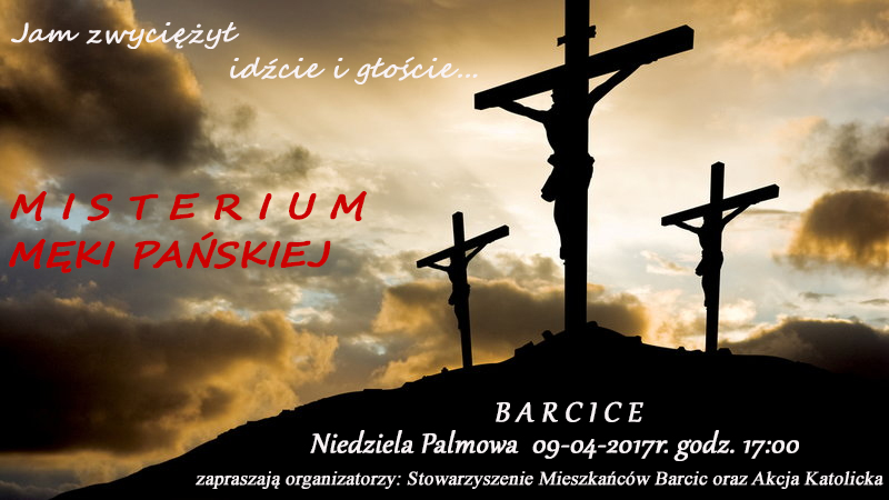 W niedzielę palmową 9 kwietnia 2017r. o godz. 17:00 w Barcicach po raz kolejny odbędzie się Plenerowe Misterium Męki Pańskiej. Początkowe sceny wjazdu Jezusa do Jerozolimy, Ogrodu Oliwnego, Ostatniej Wieczerzy, Sanhedrynu i Pałacu Piłata zostaną rozegrane przy plebanii w Barcicach. Następnie, aktorzy wraz z wiernymi przeżywając Drogę Krzyżową przejdą do miejsca (oddalonego o ok. 1 […]