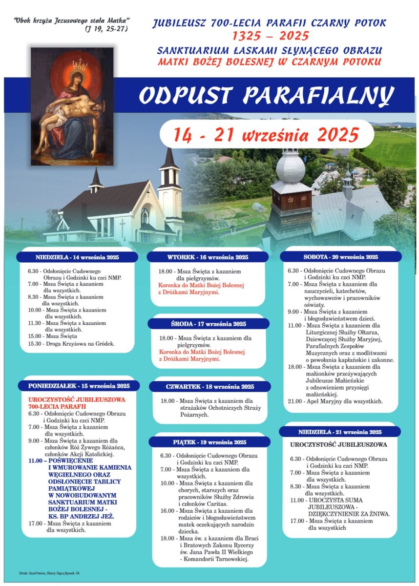 W dniach od 14 do 21 września 2025 roku parafia w Czarnym Potoku zaprasza wiernych oraz pielgrzymów z całego regionu na wyjątkowe uroczystości. Tegoroczny odpust parafialny ku czci Matki Bożej Bolesnej połączony będzie z jubileuszem 700-lecia istnienia parafii – jednej z najstarszych wspólnot kościelnych w regionie. Pod hasłem „Obok krzyża Jezusowego stała Matka” (J 19, […]