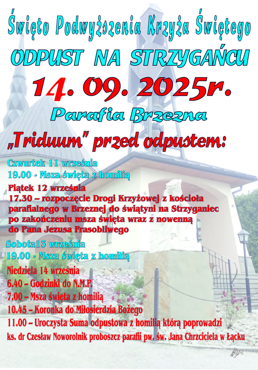 W czwartek, 11 września 2025 roku, rozpocznie się „Triduum” przygotowujące wiernych do głównych uroczystości odpustowych na Strzygańcu – miejscu szczególnym dla parafian z Brzeznej i okolic. Trzy dni duchowego przygotowania zakończą się uroczystą Sumą odpustową, która odbędzie się w niedzielę, 14 września. Plan Triduum i uroczystości odpustowych: Czwartek, 11 września – rozpoczęcie Triduum Mszą Świętą […]
