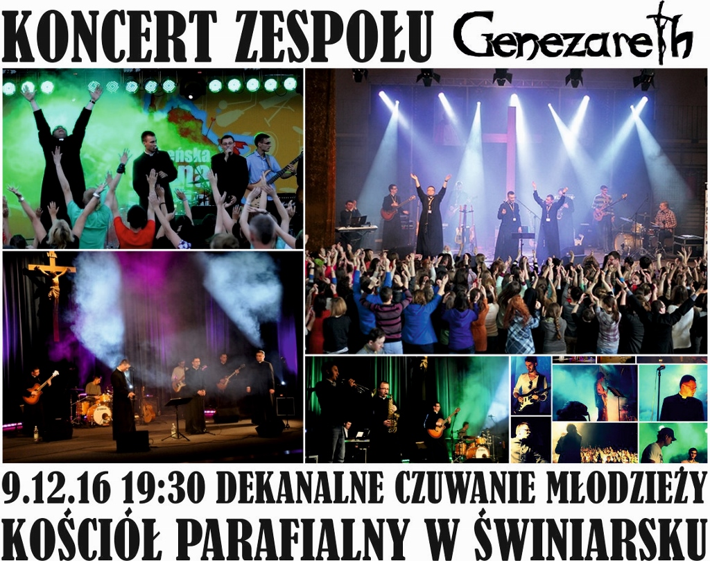 W piątek 9.12.2016r. o godz. 19.30 w Kościele Parafialnym w Świniarsku odbędzie się Dekanalne Czuwanie Młodzieży (Nowy Sącz – Zachód), podczas którego wystąpi Seminaryjny Zespół Kleryków Genezareth z Tarnowa. W programie uwielbienie Jezusa oraz koncert ewangelizacyjno-powołaniowy. Zapraszamy młodzież starszą i młodszą oraz wszystkich chętnych – również z sąsiednich parafii. Zapraszają księża i młodzież parafii Świniarsko.