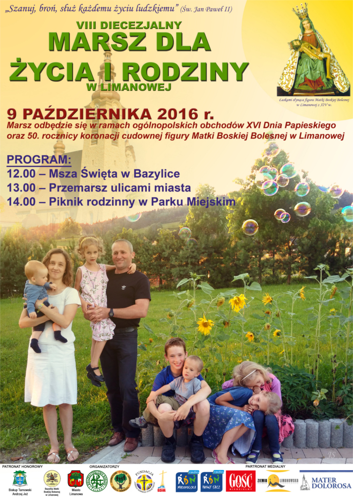 W niedzielę, 9 października ulicami Limanowej przejdzie VIII Diecezjalny Marsz dla Życia i Rodziny. Dzieci, młodzież i starsi – całe rodziny będą wspólnie się modlić i dadzą wyraz przywiązania do wartości jakimi są życie i rodzina. Marsz odbędzie się w ramach ogólnopolskich obchodów XVI Dnia Papieskiego oraz 50. rocznicy koronacji cudownej figury Matki Bożej Bolesnej […]