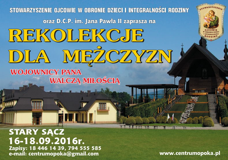 W terminie 16-18 września 2016 w Diecezjalnym Centrum Pielgrzymowania „Opoka” w Starym Sączu odbędą się rekolekcje dla mężczyzn. Koszt 120 zł/osobę. Zapisy w recepcji.