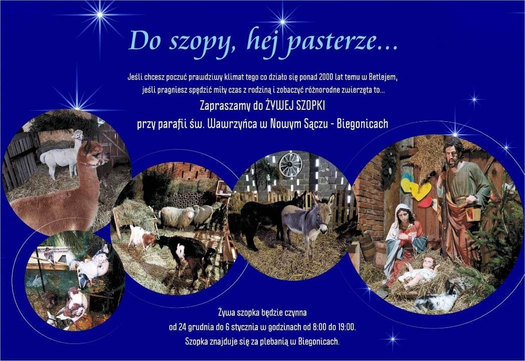 Parafia św. Wawrzyńca w Łazach Biegonickich zaprasza na żywą szopkę, która będzie czynna od 24 grudnia do 6 stycznia w godzinach 8:00 -19:00, za plebanią w Biegonicach.