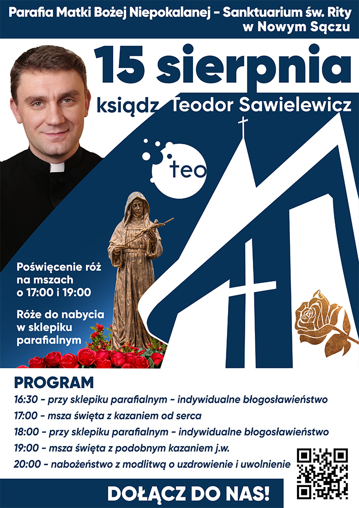 Już w najbliższą niedzielę, 15 sierpnia, w Nowym Sączu zagości ksiądz Teodor Sawielewicz, twórca Teobańkologii. Będzie on gościem w sądeckim Sanktuarium Świętej Rity, w tzw. Białym Klasztorze przy ulicy Królowej Jadwigi 44. Odprawi dwie msze święte, będzie prowadził nabożeństwo z modlitwą o uzdrowienie i uwolnienie oraz będzie udzielał indywidualnego błogosławieństwa każdemu. Czym jest Teobańkologia? „Teobańkologia, […]
