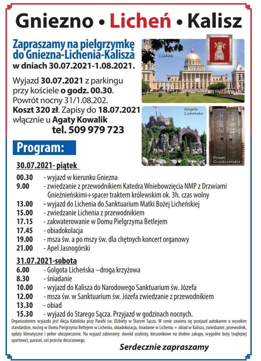 Akcja Katolicka parafii pw. św. Elżbiety w Starym Sączu zaprasza na pielgrzymkę do Gniezna–Lichenia-Kalisza w dn.30-31/01.08.2021. Wyjzad 30.07.2021 o godz.00.30. Powrót w godzinach nocnych 31/01.08.2021. Koszt 320 zł. Zapisy u Agaty Kowalik do 18.07.2021.tel.509979723.