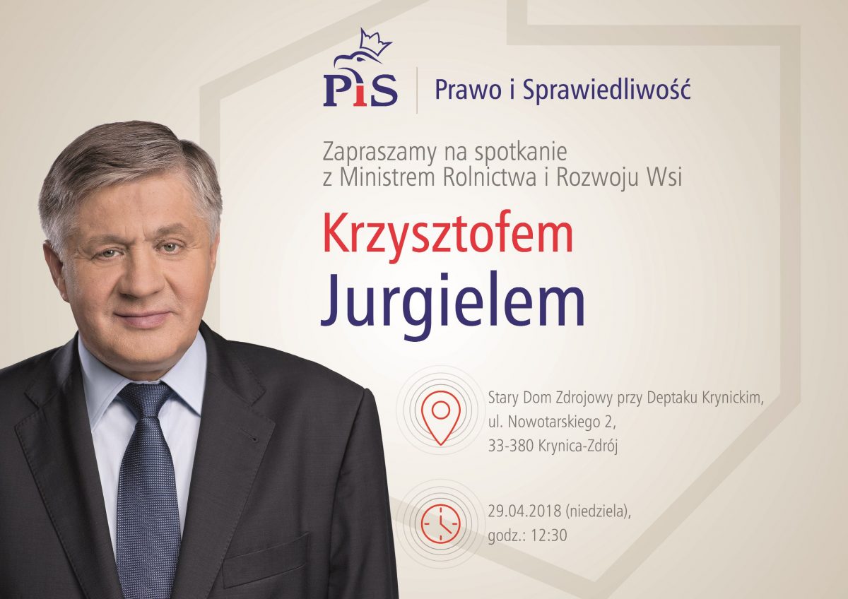 W ramach otwartych spotkań polityków Prawa i Sprawiedliwości z mieszkańcami, pod hasłem „Polska jest Jedna” w dniu 29.04.2018 r. (niedziela) o godz. 12:30 w Starym Domu Zdrojowym, ul. Nowotarskiego 2 (przy Deptaku Krynickim) w Krynicy Zdrój odbędzie się spotkanie z Ministrem Rolnictwa i Rozwoju Wsi Panem Krzysztofem Jurgielem.