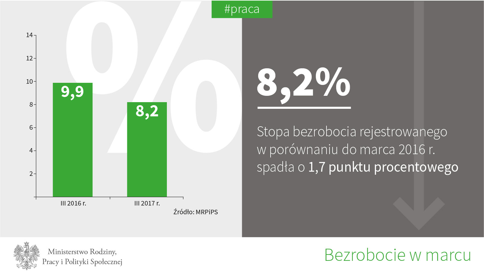 8,2%– tyle wyniosła stopa bezrobocia rejestrowanego w marcu br. według szacunków Ministerstwa Rodziny. To spadek aż o 0,3 pkt. proc. w porównaniu z lutym br. Liczba bezrobotnych na koniec marca br. wyniosła 1,33 mln osób i w porównaniu do końca lutego 2017 roku spadła o 57,7 tys. osób (o 4,2 %). W tym samym okresie […]