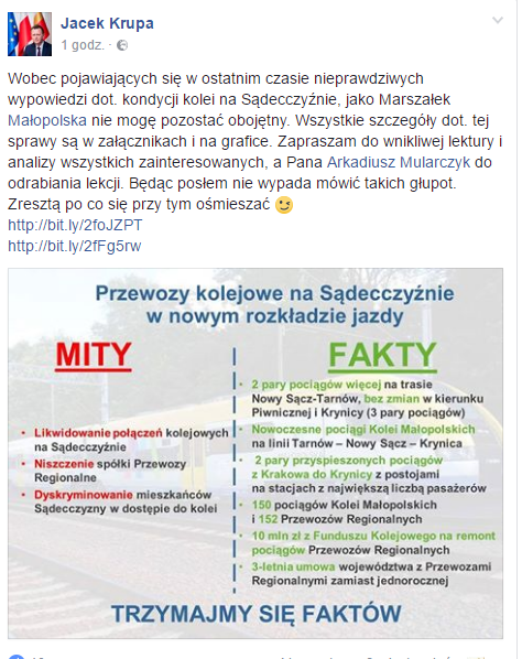 Poseł Arkadiusz Mularczyk w ślad za głosami mieszkańców Sądecczyzny prosi Najwyższą Izbę Kontrolę o przyjrzenie się czy Urząd Marszałkowski równo traktuje i zarządza spółkami: Kolejami Małopolskimi i Przewozami Regionalnymi. Pasażerowie i pracownicy tej ostatniej spółki twierdzą, że zarząd województwa celowo marginalizuje tę ostatnią odcina od świata Sądecczyznę. –11 grudnia wchodzi w życie rozkład jazdy Kolei […]