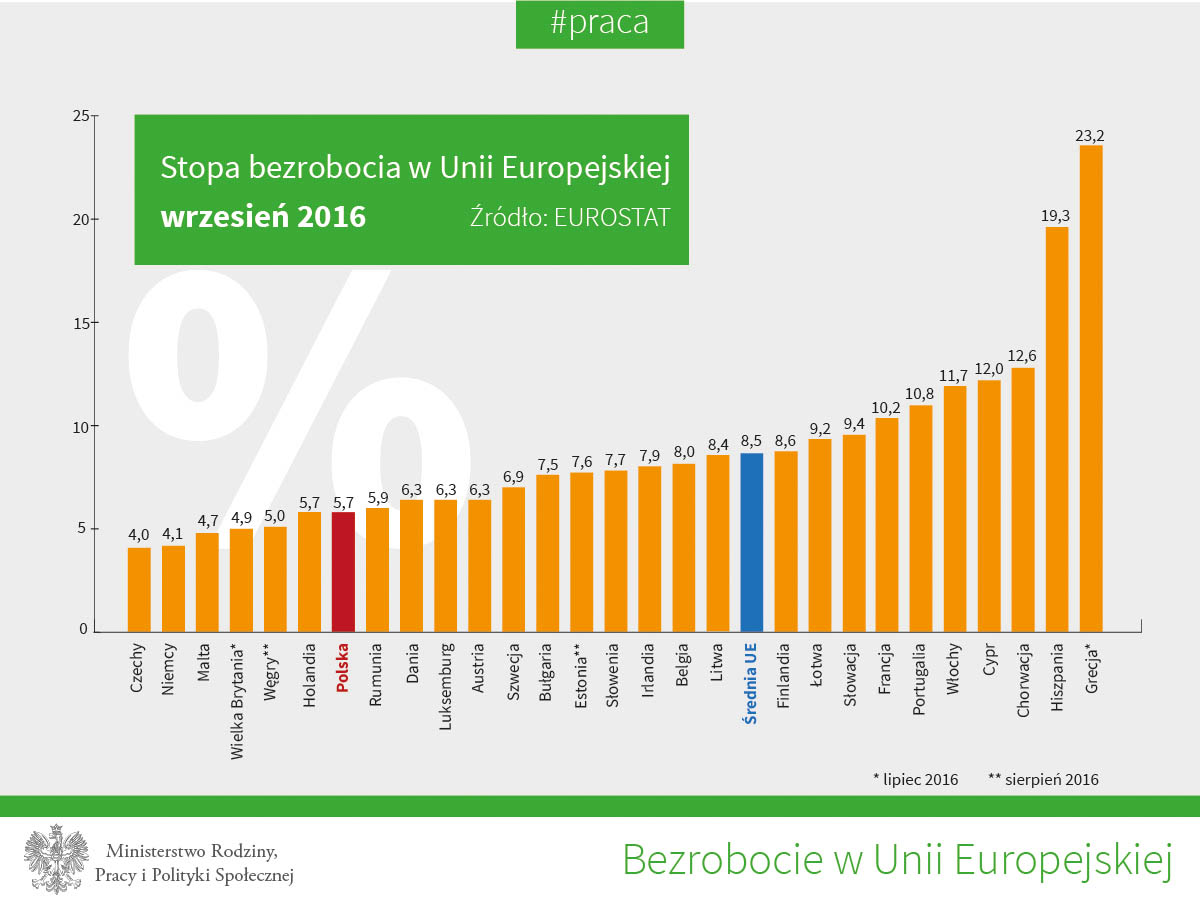 Bezrobocie we wrześniu w Polsce wyniosło 5,7 proc., wobec 5,9 proc. w sierpniu – podaje Eurostat. W Unii Europejskiej stopa bezrobocia wyniosła 8,5 proc, spadając z 9,2 proc. we wrześniu 2015 r. Polska znajduje się w europejskiej czołówce krajów z najniższym bezrobociem, utrzymując się na 7. miejscu. Polska znalazła się wśród 10. krajów o najniższej […]