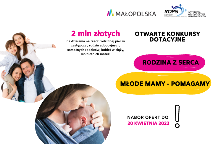 Samorząd Województwa Małopolskiego realizuje politykę ukierunkowaną na wsparcie rodziny rozumianej nie tylko jako rodzina biologiczna, ale także zastępcza czy adopcyjna, otaczająca opieką dzieci potrzebujące szczególnej pomocy i wsparcia. 29 marca 2022 r. zostały uruchomione środki w ramach dwóch otwartych konkursów ofert: „Rodzina z Serca” i „Młode Mamy – Pomagamy!”. Oba konkursy mają na celu wsparcie małopolskich rodzin, uwzględniające ich […]