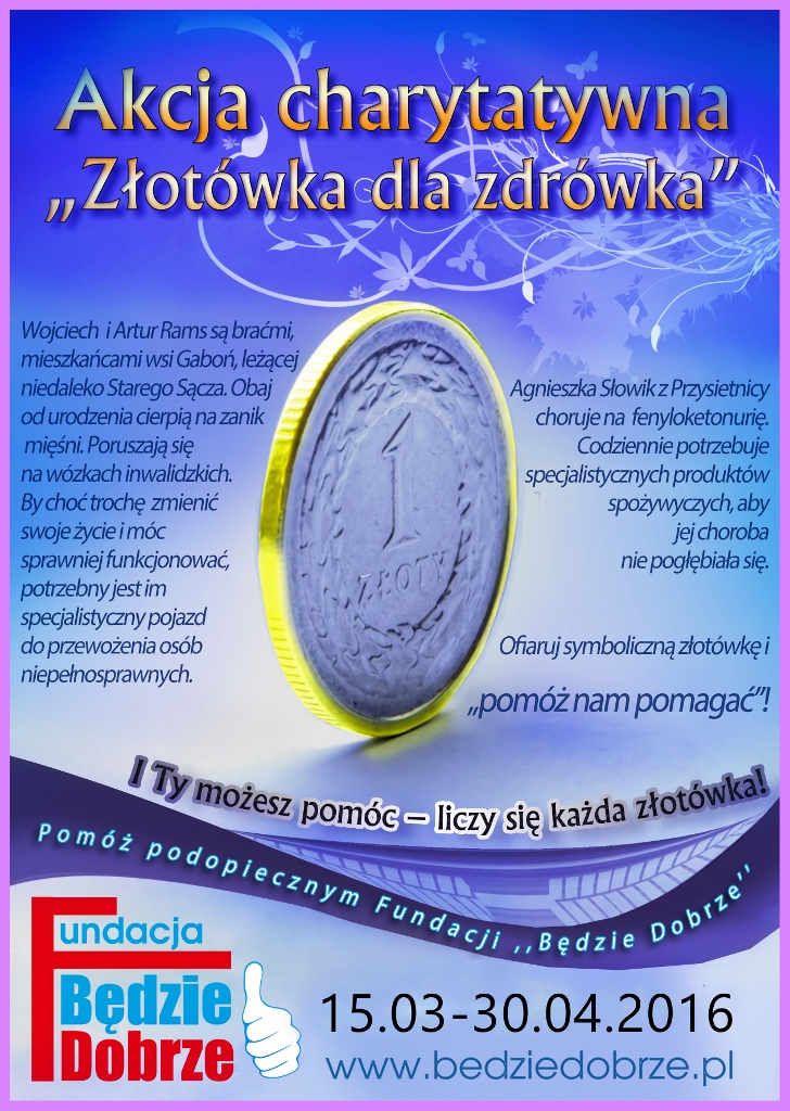 Już od 15 marca starosądecka Fundacja „Będzie Dobrze” po raz kolejny rusza z akcją charytatywną „Złotówka dla zdrówka”. Akcja obejmuje kilkanaście szkół i uczelni wyższych w naszym powiecie. – Akcja cieszy się dużą popularnością i ma uwrażliwić młodzież na pomoc innym – mówi prezes Anna Pych Co roku w akcję włącza się PWSZ w Nowym […]