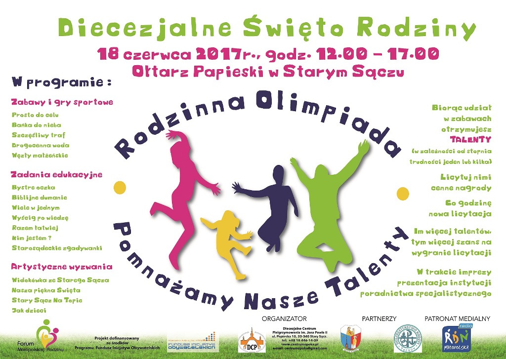 Już w najbliższą niedzielę (18 czerwca) przy Ołtarzu Papieskim w Starym Sączu wystartuje Rodzinna Olimpiada, która towarzyszyć będzie Diecezjalnemu Świętu Rodziny. Olimpiada jest kolejnym wydarzeniem realizowanym w ramach projektu FORUM MAŁOPOLSKIEJ RODZINY, realizowanego przez Diecezjalne Centrum Pielgrzymowania im. Jana Pawła II w Starym Sączu. Olimpiada Rodzinna to inicjatywa, która za cel stawia sobie integrację rodziny poprzez […]
