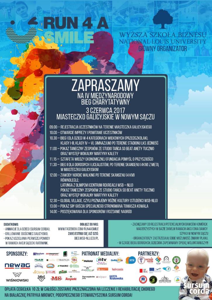 Studenci WSB-NLU serdecznie zapraszają mieszkańców Nowego Sącza i Sądecczyzny na Run 4 a Smile, czyli imprezę charytatywną, której głównym punktem jest IV Międzynarodowy Bieg Charytatywny po uśmiech Patryka Mrowcy. Wydarzenie odbędzie się 3 czerwca 2017r, w Miasteczku Galicyjskim. W tym roku, dodatkowo, w trakcie trwania imprezy będzie możliwość zarejestrowania się do bazy potencjalnych Dawców krwiotwórczych komórek macierzystych Fundacji DKMS, […]