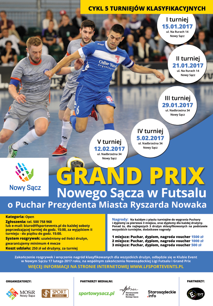 Pragniemy serdecznie zaprosić na Turniej GRAND PRIX Nowego Sącza w Futsalu, o Puchar Prezydenta Miasta Ryszarda Nowaka, który zostanie rozegrany w niedzielę 15 stycznia od godziny 10:00 na hali sportowej na Rurach w Nowym Sączu. Rozgrywki zostaną przeprowadzone w kategorii OPEN (bez limitu czynnych zawodników) od 16 lat w górę, natomiast więcej informacji co do […]