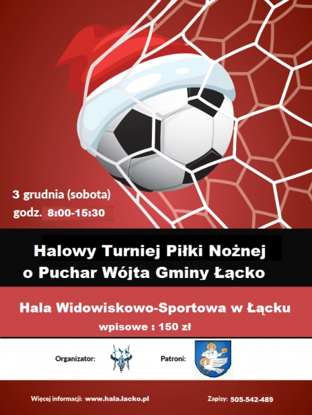 Zapraszamy wszystkich chętnych do wzięcia udziału w turnieju piłkarskim, który rozegrany zostanie 3 grudnia 2016 roku na Hali Widowiskowo-Sportowej w Łącku ORGANIZATOR: Hala Widowiskowo – Sportowa w Łącku CEL IMPREZY: wyłonienie mistrzowskiej drużyny, propagowanie piłki nożnej wśród uczestników, angażowanie społeczeństwa do aktywności ruchowej, rozwój sprawności fizycznej i umysłowej, zachęcenie do aktywnego spędzania czasu wolnego, sport […]