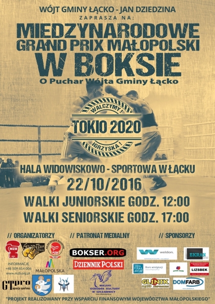 Zapraszamy wszystkich sympatyków boksu na Międzynarodowe Grand Prix Małopolski w Boksie o Puchar Wójta Gminy Łącko. Gala przeprowadzona zostanie 22 października 2016 r. na Hali Widowiskowo Sportowej w Łącku. Walki juniorskie godz. 12:00 Walki seniorskie godz. 17:00 Więcej szczegółów na załączonym plakacie.