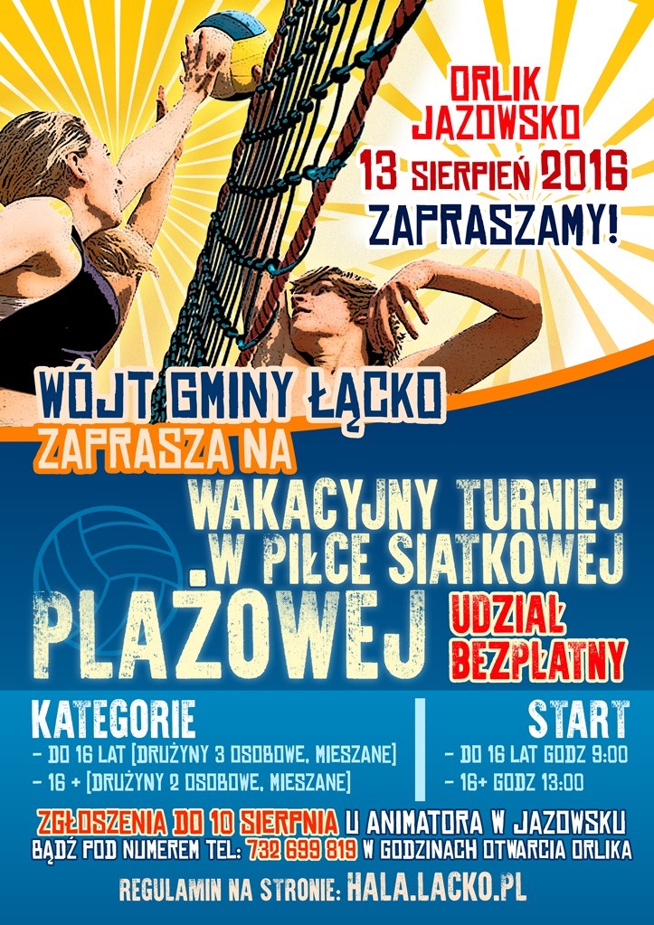 Wójt Gminy Łącko zaprasza na Wakacyjny Turniej w Piłce Siatkowej Plażowej. Szczegóły na plakacie. Zapraszamy do udziału w turnieju.